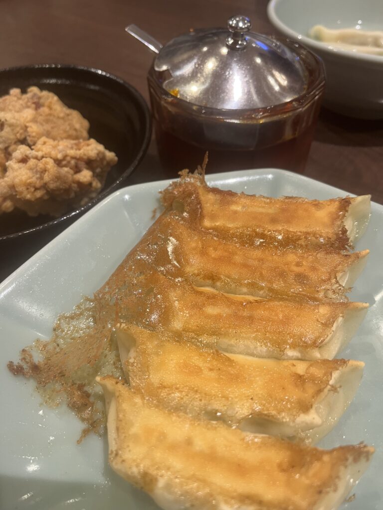 こちらでは焼き餃子、水餃子とから揚げビールを注文。