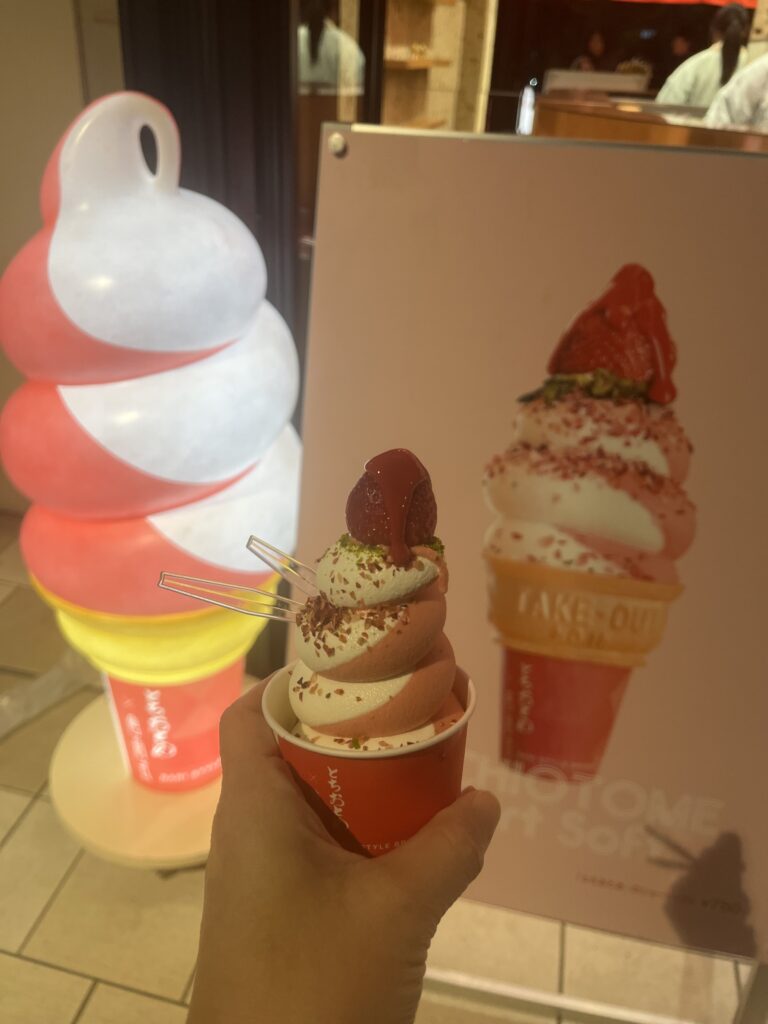 ホテルから駅に向かう途中にある“とちおとめのソフトクリーム“に目が止まってしまい、普段冷たいものはあまり好きではないはずが少し迷って購入。