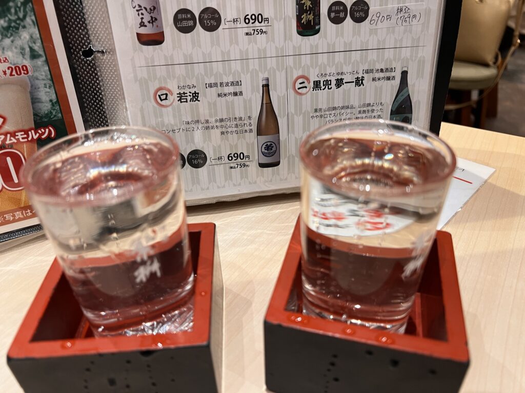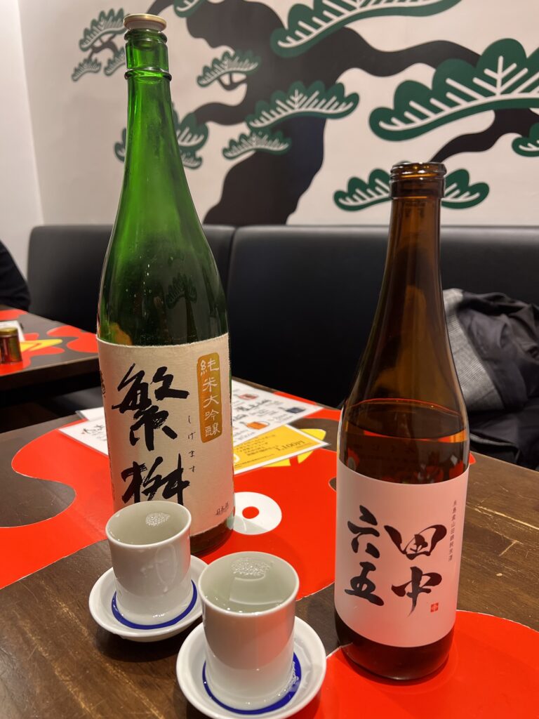 お目当てはお客様に教えていただいた、福岡の日本酒!九州は焼酎のイメージが強いけど福岡は実は日本酒も美味しいよ!ということで田中六五と繁桝をいただきます!