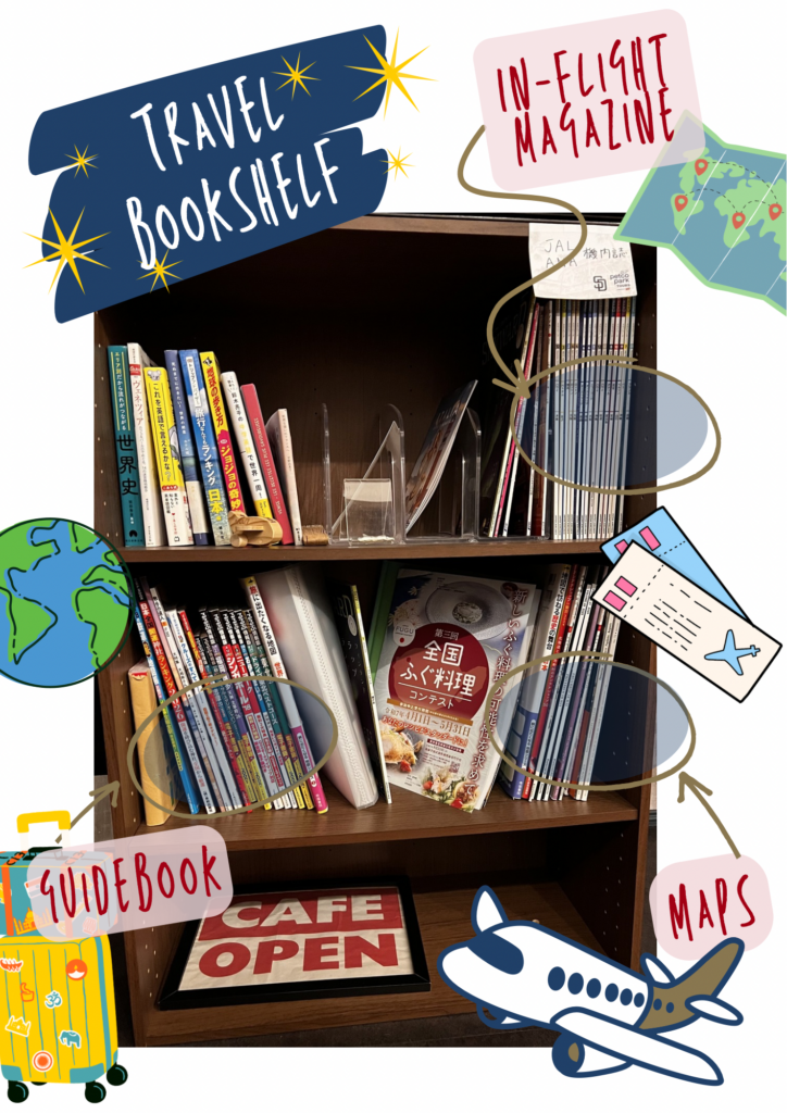 2月は旅カフェ強化月間として、店内で旅雑誌や機内誌が読めるように本棚を作って雑誌を増やしたり、少しずつ変化しています📚